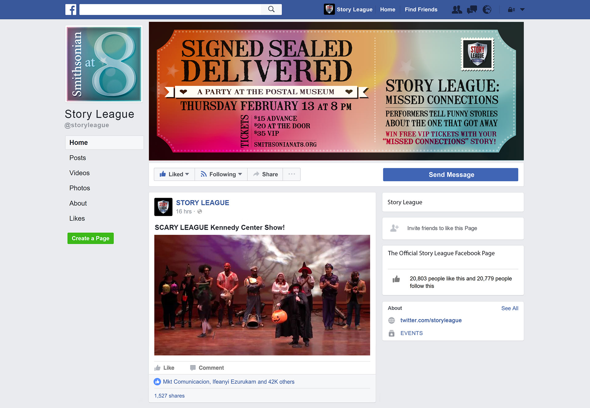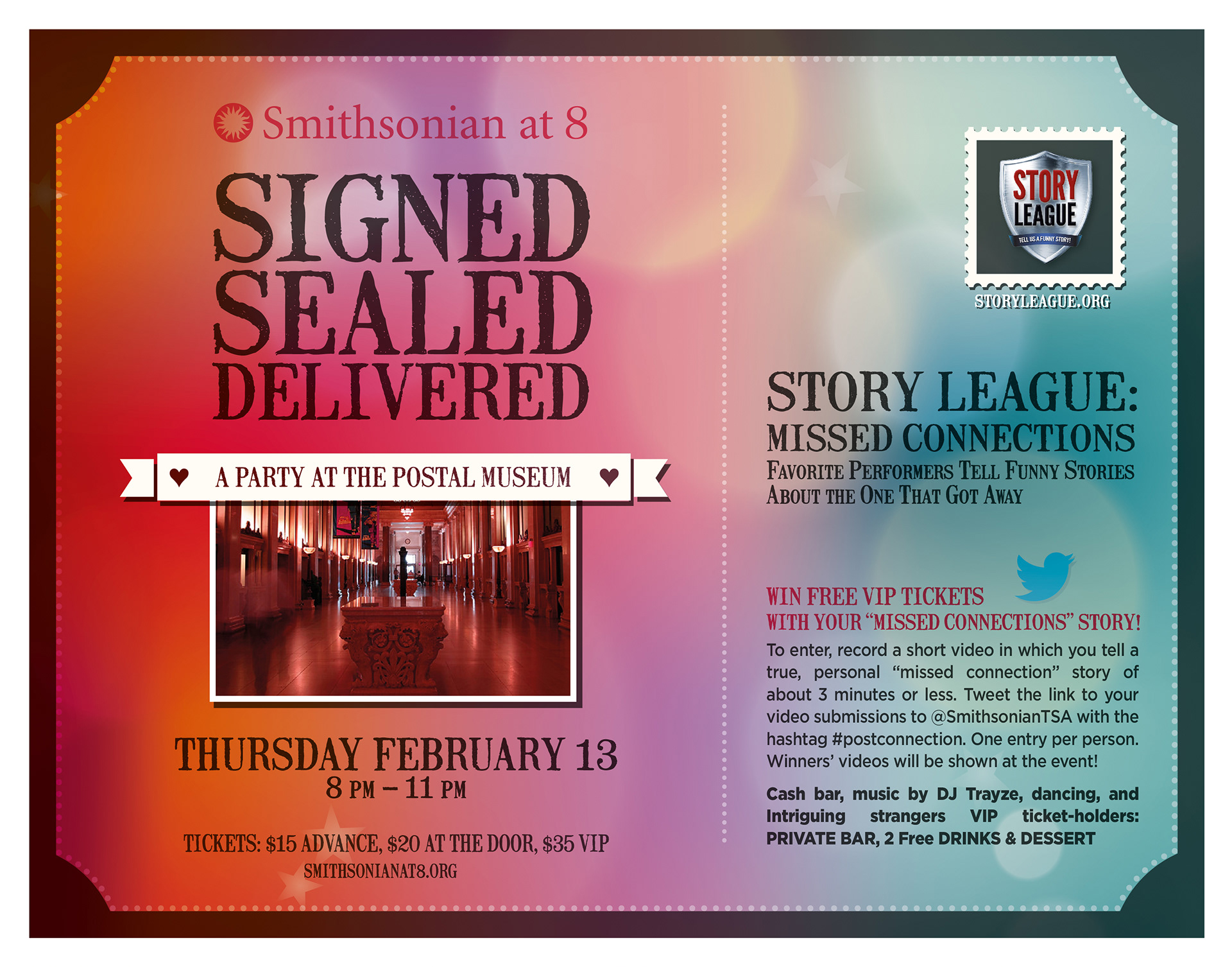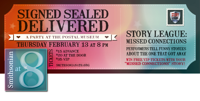 A pre-Valentine's day social event at the Smithsonian Postal Museum hosted by Story League. Smithsonian at 8 Logo | Postcard | Social Banners